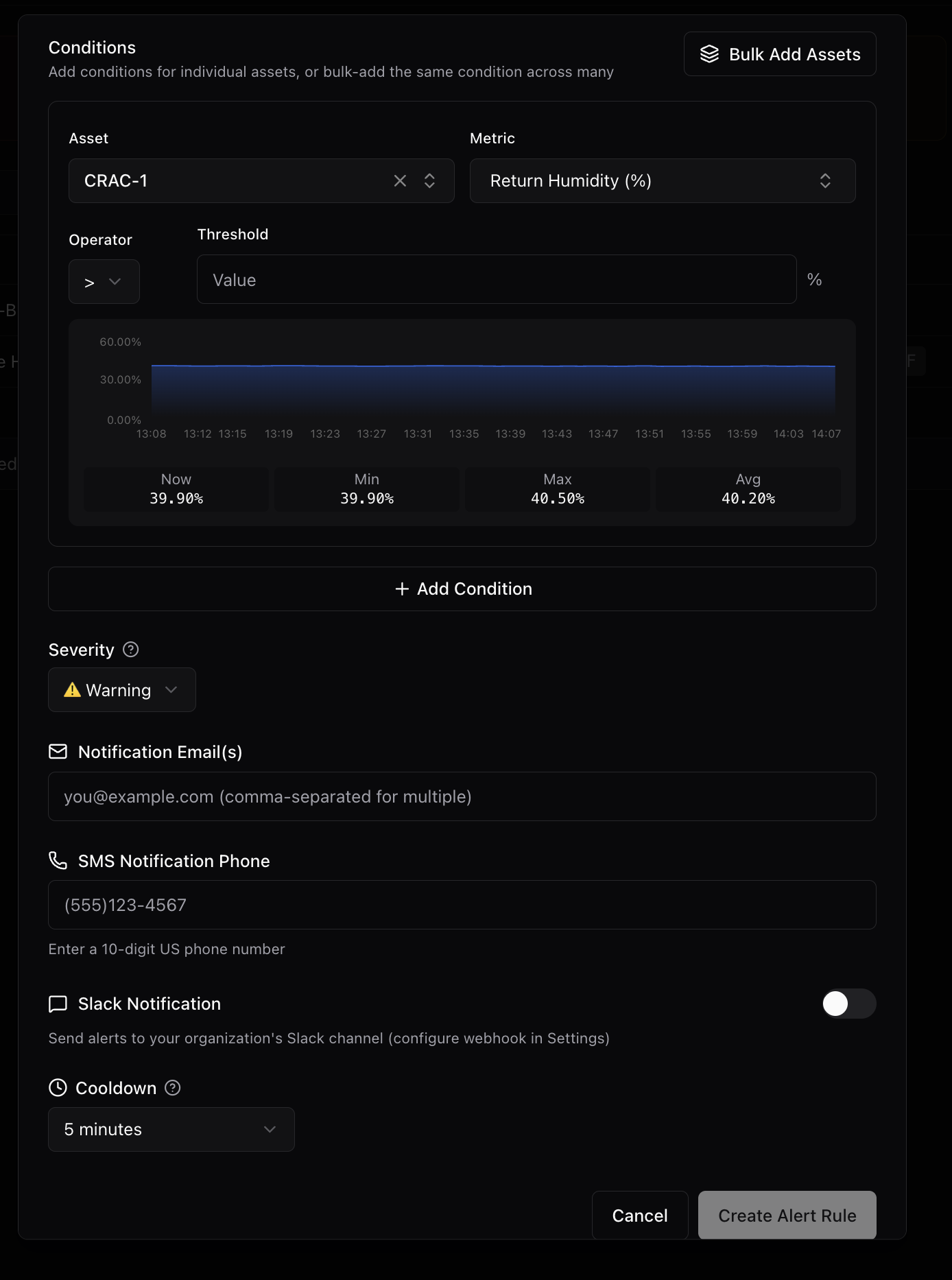 Conditional rules that span systems: 'if UPS load exceeds 80% AND chiller output drops.' Built-in cooldown and dedup logic to prevent alert storms. Routes to Slack, email, SMS, PagerDuty.
